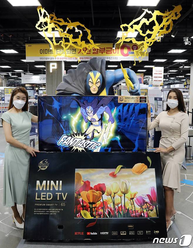 (서울=뉴스1) = 24일 이마트 영등포점 일렉트로마트에서 모델들이 이마트가 새롭게 출시한 프리미엄 스마트TV, '일렉트로맨 블랙 미니LED 65인치 TV'를 소개하고 있다. (이마트 제공) 2021.10.24/뉴스1