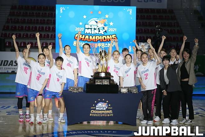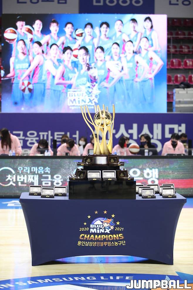 24일 용인체육관에서 열린 2021-2022 여자프로농구 용인 삼성생명과 청주 KB스타즈의 개막전 경기, 개막 경기에 앞서 지난 시즌 챔피언 결정전에서 승리한 용인 삼성생명 선수단의 챔피언 반지 전달식이 열렸다.