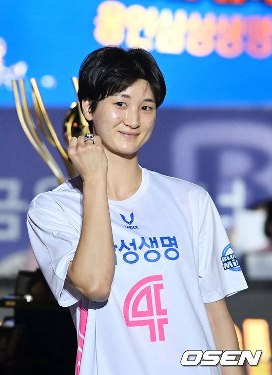 경기 전 삼성생명 선수단 반지 전달식에서 삼성생명 윤예빈이 포즈를 취하고 있다. 2021.10.24 / rumi@osen.co.kr