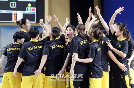 삼성생명 2021-22 여자프로농구 공식개막전 삼성생명과 KB스타즈의 경기가 24일 오후 용인 실내체육관에서 열렸다. 경기전 KB 선수들이 모여 파이팅을 외치고있다.