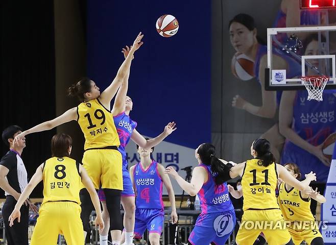 (용인=연합뉴스) 홍기원 기자 = 24일 경기도 용인실내체육관에서 열린 여자프로농구 삼성생명 블루밍스와 KB 스타즈의 경기. 양 팀 선수들이 점프볼로 경기를 시작하고 있다. 2021.10.24