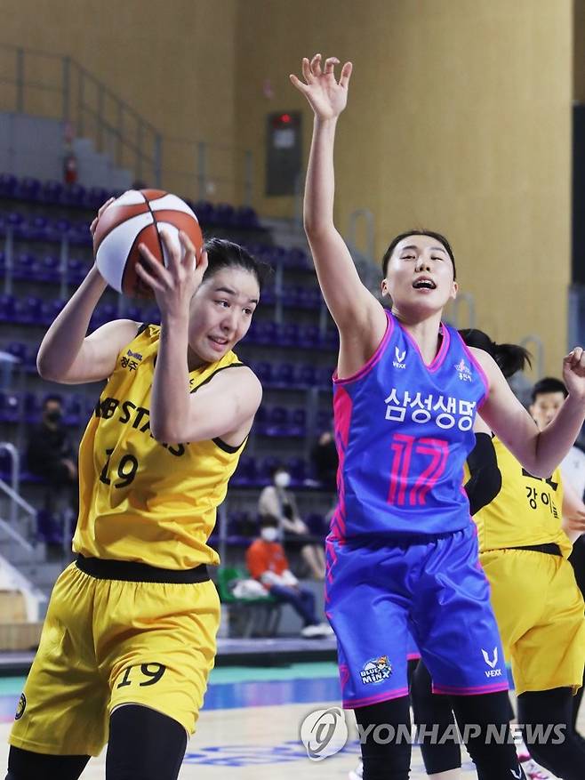 (용인=연합뉴스) 홍기원 기자 = 24일 경기도 용인실내체육관에서 열린 여자프로농구 삼성생명 블루밍스와 KB 스타즈의 경기. KB 박지수가 리바운드를 잡고 있다. 2021.10.24