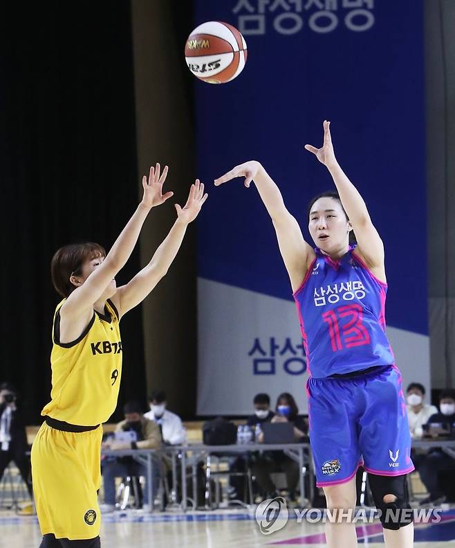 (용인=연합뉴스) 홍기원 기자 = 24일 경기도 용인실내체육관에서 열린 여자프로농구 삼성생명 블루밍스와 KB 스타즈의 경기. 삼성생명 김단비가 슛하고 있다. 2021.10.24