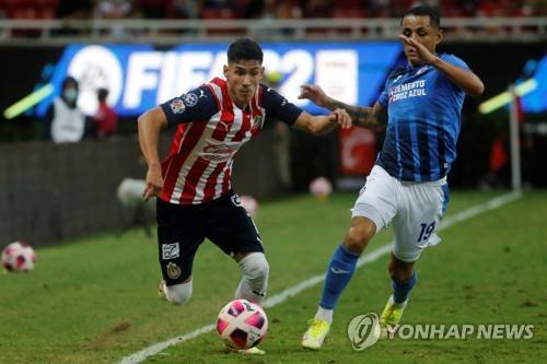 epa09542639 Carlos Antuna (L) of Guadalajara in action against Victor Yotun (R) of Cruz Azul during the Liga MX 2021 Apertura Tournament soccer match between Guadalajara and Cruz Azul at the Akron Stadium, in Zapopan, Mexico, 23 October 2021. EPA/Francisco Guasco