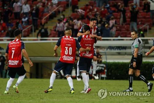 epa09542638 Guadalajara players celebrate a goal against Cruz Azul during the Liga MX 2021 Apertura Tournament soccer match between Guadalajara and Cruz Azul at the Akron Stadium, in Zapopan, Mexico, 23 October 2021. EPA/Francisco Guasco
