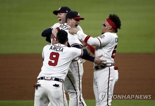 epa09542641 The Atlanta Braves celebrate defeating the Los Angeles Dodgers at the conclusion of game six of the MLB National League Championship Series playoff baseball game between the Los Angeles Dodgers and the Atlanta Braves at Truist Park in Atlanta, Georgia, USA, 23 October 2021. EPA/BRANDEN CAMP
