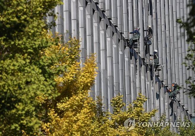 (서울=연합뉴스) 이지은 기자 = 24일 오전 서울시내 한 빌딩에서 청소업체 직원들이 외벽 유리창을 닦고 있다. 2021.10.24
