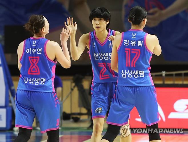 (용인=연합뉴스) 홍기원 기자 = 24일 경기도 용인실내체육관에서 열린 여자프로농구 삼성생명 블루밍스와 KB 스타즈의 경기. 데뷔 첫 득점을 올린 이해란이 동료들과 하이파이브를 하고 있다. 2021.10.24