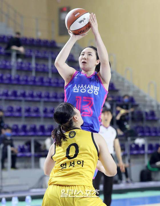 삼성생명 2021-22 여자프로농구 공식개막전 삼성생명과 KB스타즈의 경기가 24일 오후 용인 실내체육관에서 열렸다. 삼성 김단비가 KB 엄서이의 수비를 피해 슛하고있다.