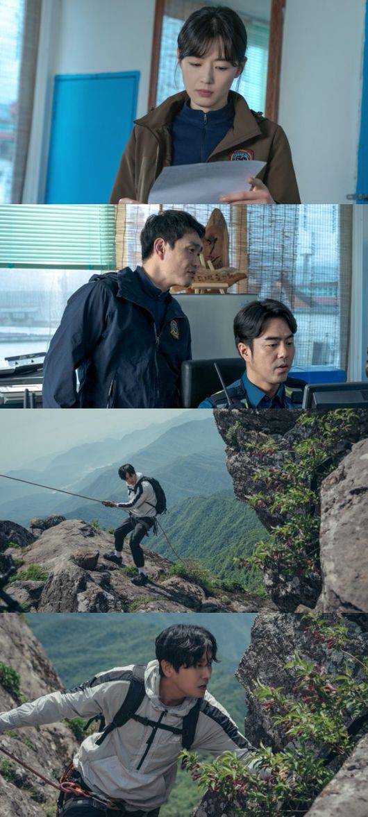 강현조는 신입의 패기를 그대로 보여주듯 홀로 절벽을 타며 수색에 나섰다. 뒤로 보이는 푸른 하늘과 산의 능선이 그 아찔한 높이를 실감케 하는 가운데 그는 조심스레 한 발씩 내딛으며 목표 지점으로 향하고 있다.