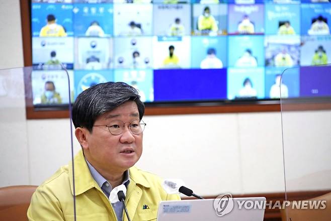 (서울=연합뉴스) 김승두 기자 = 전해철 중대본 2차장(행정안전부 장관)이 24일 정부서울청사에서 열린 코로나19 대응 중앙재난안전대책본부 회의를 주재하고 있다. 2021.10.24