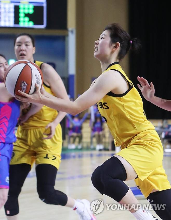 (용인=연합뉴스) 홍기원 기자 = 24일 경기도 용인실내체육관에서 열린 여자프로농구 삼성생명 블루밍스와 KB 스타즈의 경기. KB 허예은이 슛을 하고 있다. 2021.10.24
