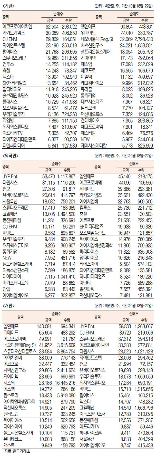 [표]주간 코스닥 기관·외국인·개인 순매수·도 상위종목(10월 18일~22일)