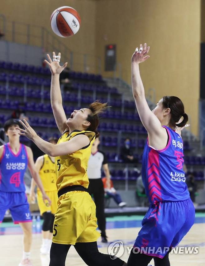 (용인=연합뉴스) 홍기원 기자 = 24일 경기도 용인실내체육관에서 열린 여자프로농구 삼성생명 블루밍스와 KB 스타즈의 경기. KB 심성영이 슛을 하고 있다. 2021.10.24