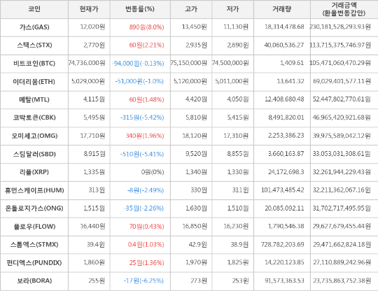 또한, 스택스(2.21%, 2,770원), 오미세고(1.96%, 17,710원), 메탈(1.48%, 4,115원), 펀디엑스(1.36%, 1,860원), 스톰엑스(1.03%, 39.4원), 플로우(0.43%, 16,440원)가 상승세를 나타냈다.