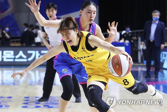 (용인=연합뉴스) 홍기원 기자 = 24일 경기도 용인실내체육관에서 열린 여자프로농구 삼성생명 블루밍스와 KB 스타즈의 경기. KB 김민정이 돌파를 하고 있다. 2021.10.24