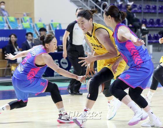 삼성생명 2021-22 여자프로농구 공식개막전 삼성생명과 KB스타즈의 경기가 24일 오후 용인 실내체육관에서 열렸다. KB 박지수가 골밑을 파고 들다 공을 뺏기고있다.