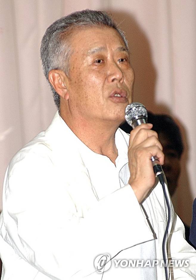 사진은 지난 2003년 7월 2일 출범한 `한미투자협정 저지와 스크린쿼터 지키기 영화인 대책위원회'에서 공동대표로 추대된 이태원 대표가 기자회견 도중 발언하는 모습. 2021.10.24 [연합뉴스 자료사진]