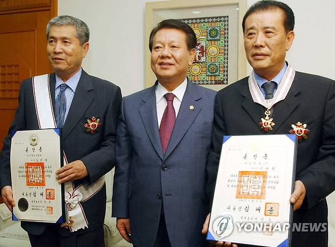사진은 2002년 7월 8일 당시 남궁진(南宮鎭) 문화관광부 장관에게 문화공로 수훈한 이태원 태흥영화사 대표(오른쪽)와 임권택 감독. 2021.10.24 [연합뉴스 자료사진]