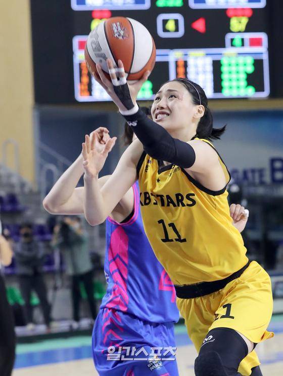 삼성생명 2021-22 여자프로농구 공식개막전 삼성생명과 KB스타즈의 경기가 24일 오후 용인 실내체육관에서 열렸다. KB 강이슬이 삼성 수비를 따돌리고 슛하고있다.