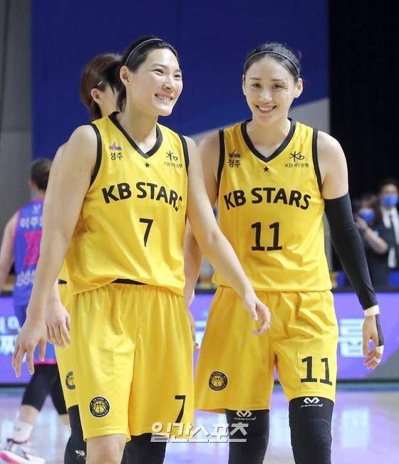삼성생명 2021-22 여자프로농구 공식개막전 삼성생명과 KB스타즈의 경기가 24일 오후 용인 실내체육관에서 열렸다. KB가 68-59로 승리했다. 경기종료후 KB 최희진 강이슬이 미소 지으며 코트를 내려 오고있다.