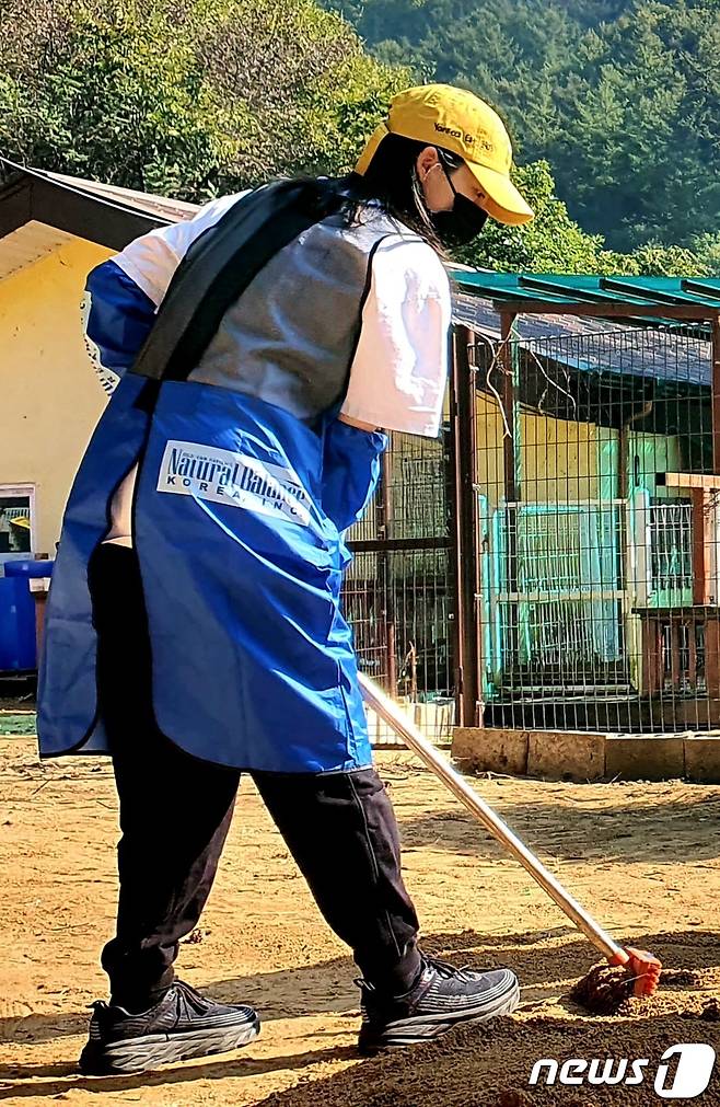 (용인=뉴스1) 최서윤 기자 = 그룹 카라 출신 배우 강지영이 24일 경기 용인시의 한 사설 유기견보호소에서 청소하고 있다. 강지영은 이날 내추럴발란스 블루엔젤봉사단이 진행한 봉사활동에 참여했다. 2021.10.24/뉴스1