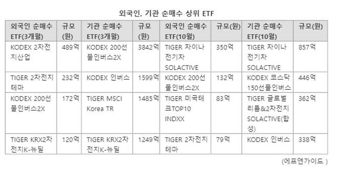 반면 국내 기관은 테마형 ETF보다는 지수형 ETF를 더 많이 사들였다. 최근 3개월간 기관이 가장 많이 사들인 ETF는 ‘KODEX 200선물인버스2X’로 3842억원을 순매수했다. 곱버스로 불리는 KODEX 200선물인버스2X는 코스피200 지수를 역으로 2배 추종한다. 코스피200 선물지수를 마이너스(-) 2배수 만큼 따라가도록 설계돼 지수가 떨어질수록 이익이 난다. 코스피200 지수가 1% 하락하면 2%의 수익이 나고 1% 상승하면 2%의 손실이 나는 구조다.