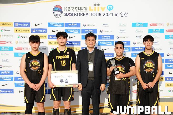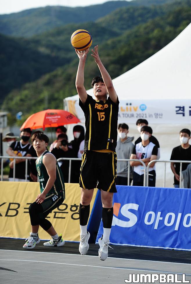 24일 경남 양산시 양산천인라인스케이트장 특설코트에서 열린 KB국민은행 Liiv M 3x3 코리아투어 2021 3차 양산대회(이하 코리아투어) 고등부 결승에서 에이스 정주익이 결정적인 장면에서 터져준 소쿠리섬이 멘토즈X클린샷을 12-9로 무너뜨리고 감격의 우승을 차지했다.