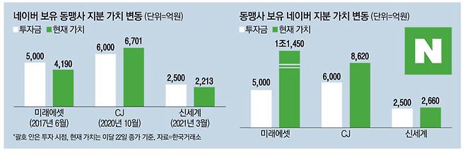 지난해 10월과 올해 3월 네이버와 지분을 교환한 CJ(6000억원)와 신세계(2500억원)도 평가이익을 보고 있다. CJ그룹(CJ ENM·CJ대한통운·스튜디오드래곤)이 현재 보유한 네이버 지분 가치는 1년 새 40% 이상 상승하면서 8600억원을 넘어섰다. 올 3월 네이버 지분을 확보한 신세계그룹(신세계인터내셔날·이마트)은 평가액이 2660억원으로 약 6.4%의 수익률을 기록하고 있다. 투자 기간은 다르지만 동맹 3사의 네이버 투자 평가이익만 1조원에 달한다.