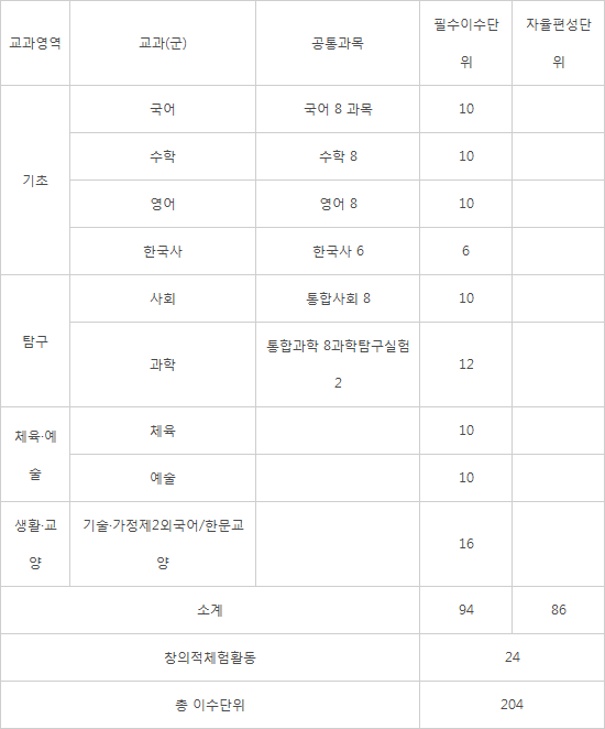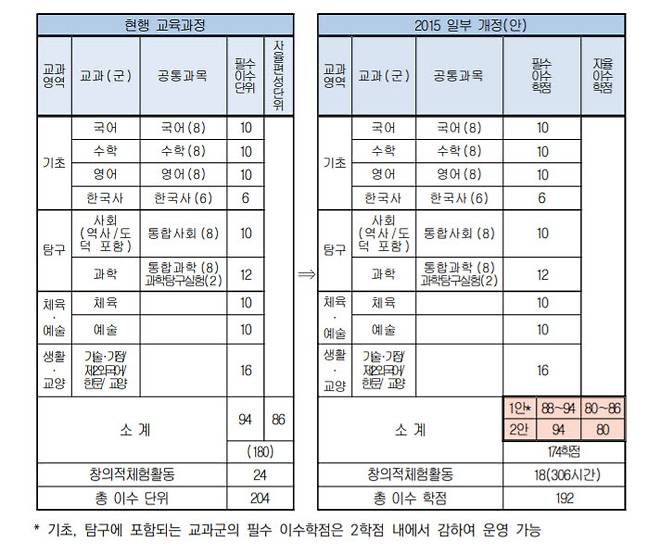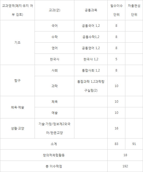국·영·수·한국사·사회·과학 등은 학기 단위 운영에 맞게 과목1, 과목2로 분할된다. 국·영·수 필수 이수 단위는 각 10단위에서 8학점으로 줄어든다. 한국사는 6단위에서 5학점으로 줄이되, 선택과목 신설로 이를 보완하도록 했다. 사회와 과학도 10, 12단위에서 8, 10단위로 줄어든다. 필수 학점 기준이 줄었지만, 학교에서는 이같은 주요 과목에 대해 자율이수학점을 포함해 크게 늘리는 것이 보통이다. 국영수 학점 종합이 절반을 넘지 못하도록 하는 등의 조건을 달았다.