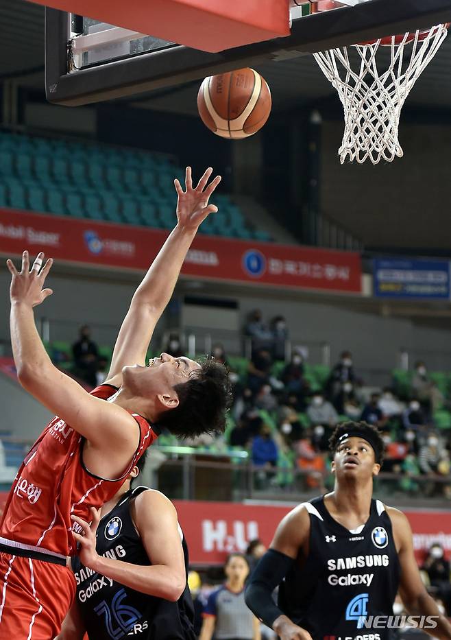 [대구=뉴시스] 이무열 기자 = 24일 오후 대구실내체육관에서 열린 ‘2021-2022 KGC인삼공사 정관장 프로농구’ 대구 한국가스공사와 서울 삼성 썬더스의 경기, 대구 신승민이 골밑 슛을 하고 있다. 2021.10.24. lmy@newsis.com