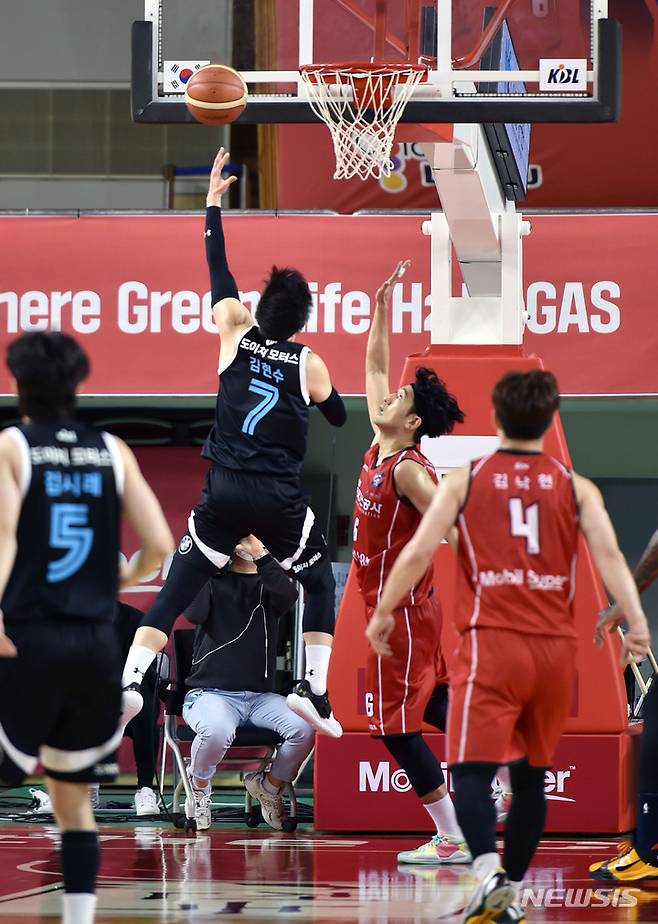 [대구=뉴시스] 이무열 기자 = 24일 오후 대구실내체육관에서 열린 ‘2021-2022 KGC인삼공사 정관장 프로농구’ 대구 한국가스공사와 서울 삼성 썬더스의 경기, 서울 김현수가 골밑 슛을 하고 있다. 2021.10.24. lmy@newsis.com