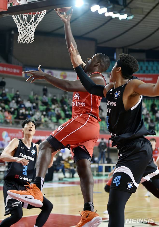 [대구=뉴시스] 이무열 기자 = 24일 오후 대구실내체육관에서 열린 ‘2021-2022 KGC인삼공사 정관장 프로농구’ 대구 한국가스공사와 서울 삼성 썬더스의 경기, 대구 앤드류 니콜슨이 골밑 슛을 하고 있다. 2021.10.24. lmy@newsis.com