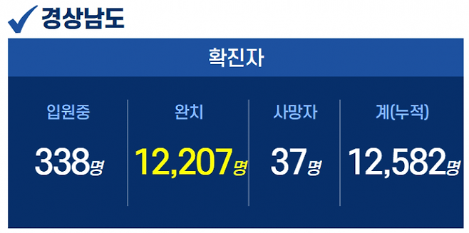 10월 24일 오후 5시 기준, 경남도내 입원 중인 확진자는 338명이고, 퇴원 1만2207명, 사망 37명, 누적 확진자는 총 1만2582명이다.