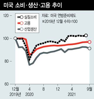 2020년 하반기부터 국내총생산(GDP)의 70%를 차지하는 소비 중심으로 미국 경제가 회복되고 있다. 개인 실질소비가 코로나19로 지난해 4월 급락했으나, 5월부터 회복세로 돌아섰고 올해 8월까지는 25.5%나 증가했다. 코로나 이전인 2019년 수준도 넘어섰다. 그러나 미국의 산업생산 회복 속도는 더디다. 지난주에 9월 통계가 발표되었는데, 2019년 말보다 아직도 9.8%나 낮은 수준이다. 국내 생산 부진으로 고용도 예상보다 느리게 증가하고 있다.