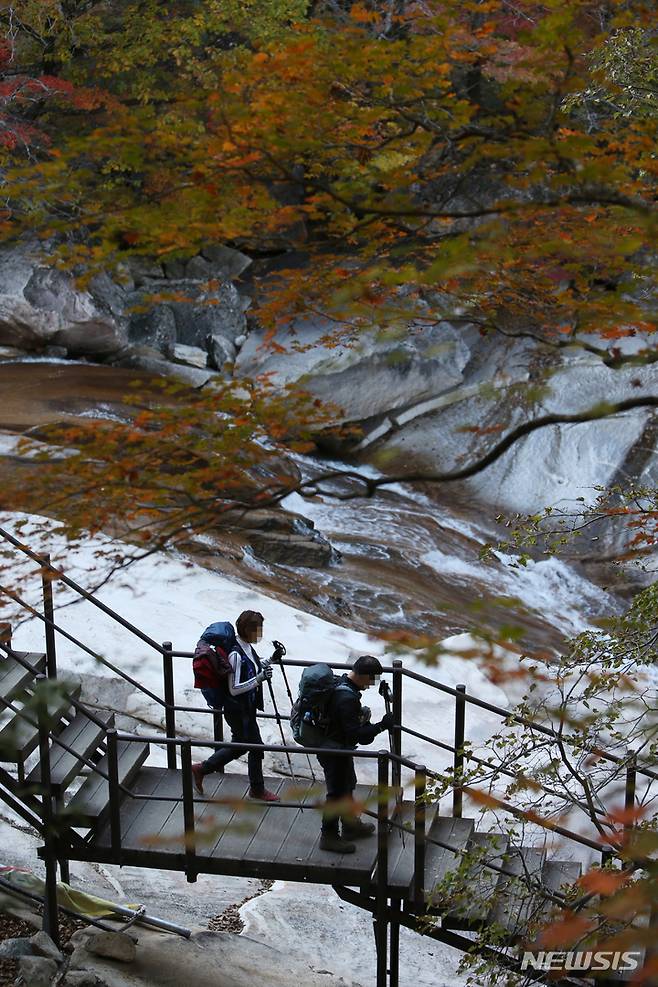 [속초=뉴시스] 김경목 기자 = 청명한 가을 하늘을 보인 24일 오후 등산객들이 강원도 속초시 설악산 국립공원 천불동 계곡에서 소공원 쪽으로 하산하고 있다. 올해 단풍은 예년에 비해 늦게 물들고 그나마 물이 든 단풍잎도 일찍 시들어 볼품이 없다. 2021.10.24. photo31@newsis.com
