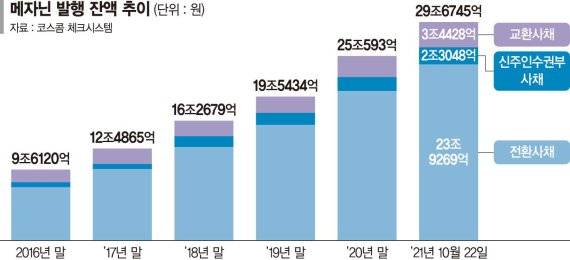 몇년 사이 메자닌 채권 규모는 빠르게 늘고 있다. 코스콤에 따르면 메자닌 발행 잔액은 22일 기준 29조6745원이다. 지난해 말 25조593억원과 비교할때 18.41%(4조6152억원)가 늘었다. 2018년 말(16조2679억원)과 비교하면 82.4%가량 증가했다.