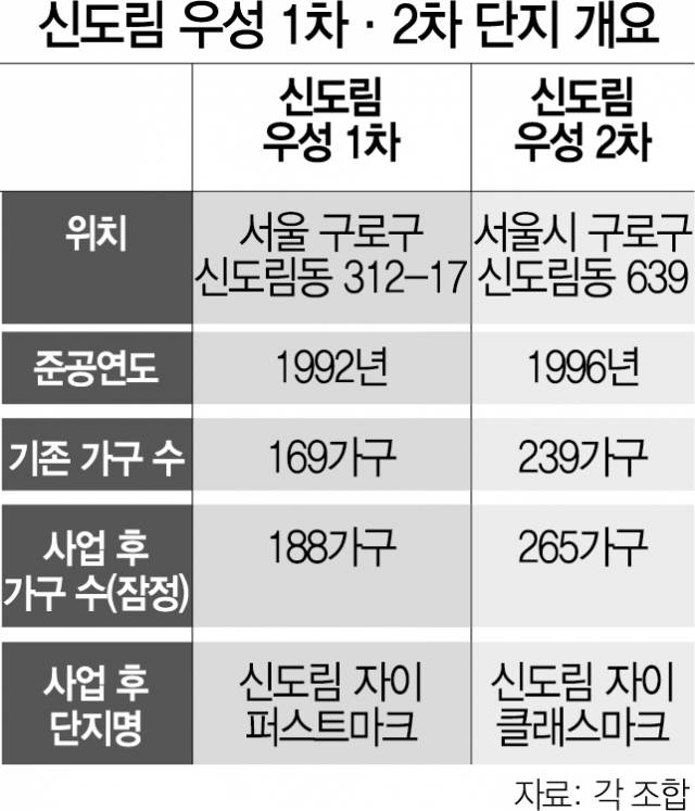 신도림 우성 1차는 1992년에 준공된 아파트로 현재 169가구 규모다. 2차는 1996년 239가구 규모로 준공됐다. 조합 관계자에 따르면 리모델링 공사 후 1차는 19가구 늘어난 188가구로, 2차는 26가구 증가한 265가구로 증축이 잠정 계획돼 있다. 기존 가구 수의 15%까지 증축이 가능한 법정 상한선보다는 증가 가구 수가 적다. 신도림 우성 2차 조합 관계자는 “법정 상한선에 따라 35가구까지 증축을 통해 분양할 수 있지만, 분양 가구 수가 30가구를 넘으면 주택도시보증공사(HUG) 심사가 까다로워진다”며 “이를 감안해 시공사에서 26가구를 제안했다”고 전했다.