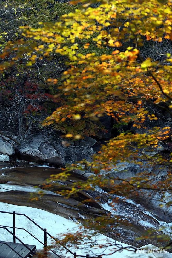 [속초=뉴시스] 김경목 기자 = 단풍 절정 시기로 예상된 24일 오후 강원도 속초시 설악산 국립공원 천불동 계곡의 단풍잎이 노랗게 물들고 있다. 올해 단풍은 예년에 비해 늦게 물들고 그나마 물이 든 단풍잎도 일찍 시들어 볼품이 없다. 2021.10.24. photo31@newsis.com