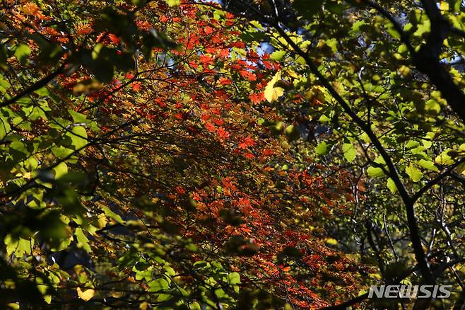 [속초=뉴시스] 김경목 기자 = 단풍 절정으로 예상된 24일 오후 강원도 속초시 설악산 국립공원 천불동 계곡의 단풍잎이 빨갛게 물들고 있다. 올해 단풍은 예년에 비해 늦게 물들고 그나마 물이 든 단풍잎도 일찍 시들어 볼품이 없다. 2021.10.24. photo31@newsis.com