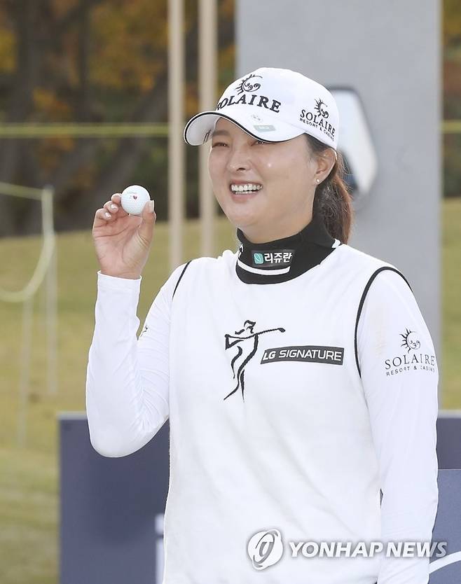 (부산=연합뉴스) 강덕철 기자 = 24일 부산 기장군 LPGA 인터내셔널 부산에서 열린 미국 여자프로골프(LPGA) 투어 BMW 레이디스 챔피언십에서 우승한 고진영이 우승 세리머니를 하고 있다. 2021.10.24