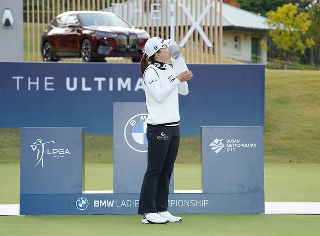[서울=뉴시스] 고승민 기자 = 고진영이 24일 부산 기장군 LPGA 인터내셔널 부산에서 열린 BMW 레이디스 챔피언십에서 우승을 차지, 한국 선수 200승의 쾌거를 이룩했다. 사진은 이날 트로피를 거머쥔 고진영. (사진=BMW코리아 제공) 2021.10.24. photo@newsis.com *재판매 및 DB 금지