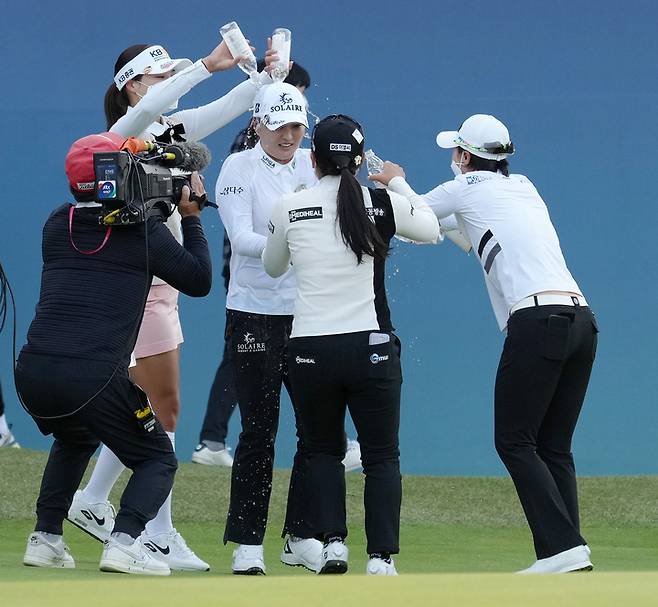 [서울=뉴시스] 고승민 기자 = 고진영이 24일 부산 기장군 LPGA 인터내셔널 부산에서 열린 BMW 레이디스 챔피언십에서 우승을 차지, 한국 선수 200승의 쾌거를 이룩했다. 사진은 이날 우승 세리머니 중인 고진영. (사진=BMW코리아 제공) 2021.10.24. photo@newsis.com *재판매 및 DB 금지
