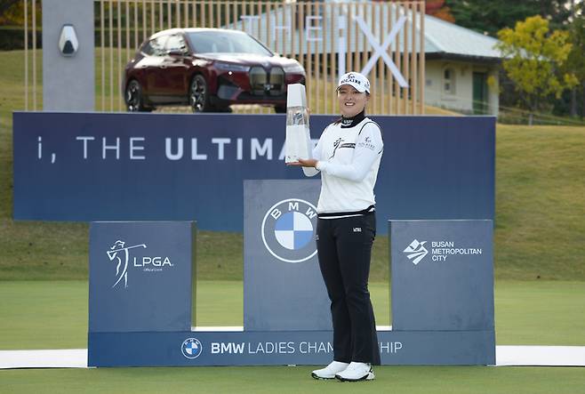 [서울=뉴시스] 고승민 기자 = 고진영이 24일 부산 기장군 LPGA 인터내셔널 부산에서 열린 BMW 레이디스 챔피언십에서 우승을 차지, 한국 선수 200승의 쾌거를 이룩했다. 사진은 이날 트로피를 거머쥔 고진영. (사진=BMW코리아 제공) 2021.10.24. photo@newsis.com *재판매 및 DB 금지