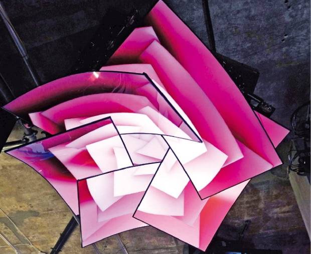 ‘빛, 현대미술의 새 물결’이라는 주제로 연말까지 열리는 이번 전시회에는 박제성 서울대 조소과 교수, 아트 팀 ‘에이스트릭트’ 등을 포함해 세계 정상급 아티스트 12개 팀이 참여했다. 휘어지는 올레드 사이니지 6장을 겹쳐 꽃잎을 형상화한 미디어아트(사진), 올레드 디스플레이 24대를 이어 붙인 대형 조형물 등이 눈길을 끌었다.