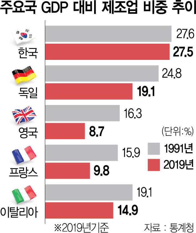 24일 경제협력개발기구(OECD) 등에 따르면 우리나라 제조업이 국내총생산(GDP)에서 차지하는 비중은 지난 1991년 27.6%에서 2019년 27.5%로 30년 새 제자리걸음이다. 반면 탄소 중립을 부르짖고 있는 유럽연합(EU)과 여타 선진국들은 지난 30여 년 동안 산업구조 전환을 사실상 마무리했다. 글로벌 제조 강국으로 불리는 독일의 GDP 대비 제조업 비중은 같은 기간 24.8%에서 19.1%로 하락했으며 금융 강국인 영국도 같은 기간 16.3%에서 8.7%로 낮아졌다. 패션과 관광 부문의 절대 강자인 프랑스(15.9%→9.8%)와 이탈리아(19.1%→14.9%) 또한 제조업 의존도가 30년 새 대폭 낮아졌다.