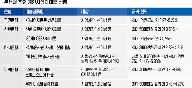 국민은행의 KB사업자든든 신용대출과 신한은행의 SOHO CSS사이버론이 최대 1억원으로 5000만원까지 조여진 개인 신용대출보다 한도가 가장 크다. KB사업자든든 신용대출의 경우 최고 금리가 연 5.27%로 낮은 편이어서 신용점수가 낮은 자영업자에게 유리하다. 반대로 하나은행의 HANA온라인 사장님 신용대출은 한도는 최대 2000만원이지만, 금리가 연 2.92~4.91%로 낮은 편이라는 게 장점이다.