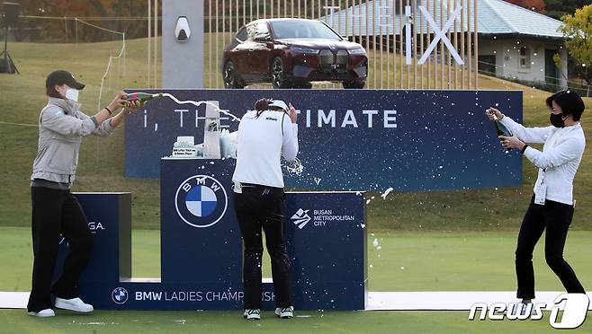 (부산=뉴스1) 여주연 기자 = 24일 부산 기장군 일광면 LPGA 인터내셔널 부산CC에서 열린 '미국여자프로골프(LPGA)투어 BMW 레이디스 챔피언십'에 참가한 고진영이 우승을 거둔 후 동료들에게 축하받고 있다. 2021.10.24/뉴스1