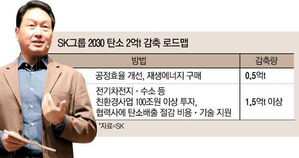 SK그룹은 2030년 2억t 규모 탄소 감축을 공정 개선과 신사업 투자 두 갈래로 진행한다. 기존 사업에서 공정 효율을 개선하고, 재생에너지를 구매하는 등의 노력으로 5000만t을 줄이고 전기차 배터리, 수소 등 친환경 신사업에 대한 투자와 협력사 지원 등을 통해 나머지 1억5000만t을 줄이겠다는 것이다.