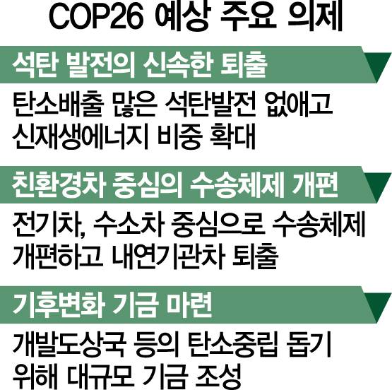 24일 외신 등에 따르면 COP26에는 200여 개국 세계 정상을 비롯해 2만 5,000여 명의 인원이 참석할 것으로 전망된다. 회의의 첫 번째 주제는 온실가스 감축이다. 기후변화에 관한 국제협의체(IPCC)에서 제시한 목표를 달성하려면 2030년까지 이산화탄소 배출량을 2010년 대비 45%가량 줄여야 하고 2050년에는 탄소 순 배출량이 ‘0’이 되는 탄소 중립을 달성해야 한다. COP26 당사국들은 5년마다 달성 여부를 점검·평가받아야 하는 NDC 및 장기 기후변화 정책 비전인 ‘2050 저탄소발전전략(LEDS)’을 유엔에 이미 제출한 만큼 이번 COP26에서 이와 관련한 세부안 마련에 나설 방침이다.